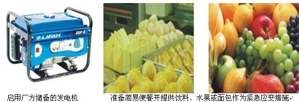 2、食堂在出现突然停电,导致工作不能正常开展时,应立即以电话等方式上报公司相关领导,由公司领导和部门负责人共同协调各方,解决停电期间开餐问题。